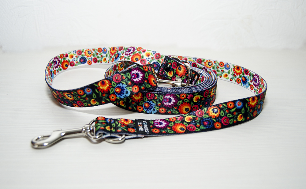 Smycz przepinana (z obu stron karabińczyki) wykonana jest z grubej taśmy poliestrowej dwustronnie drukowanej we wzory łowickie - jedna strona ma białe tło, druga czarne. Smycz jest zszywana oraz nitowana dla wzmocnienia.